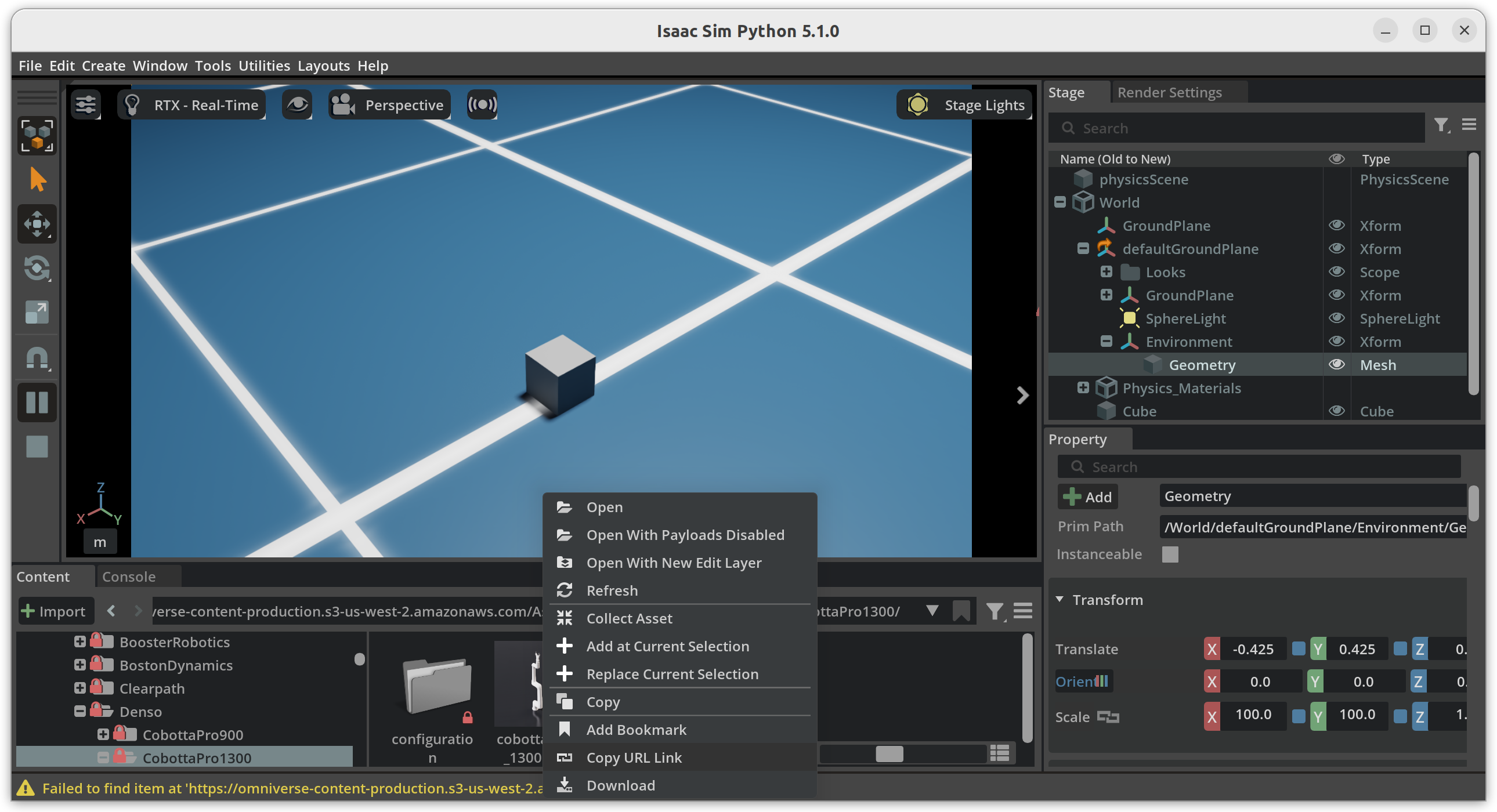 引入一个在线的 usd 资产,最好使用 https://omniverse-content-production.s3-us-west-2.amazonaws.com/Assets/Isaac/5.1/Isaac/ + xxxx